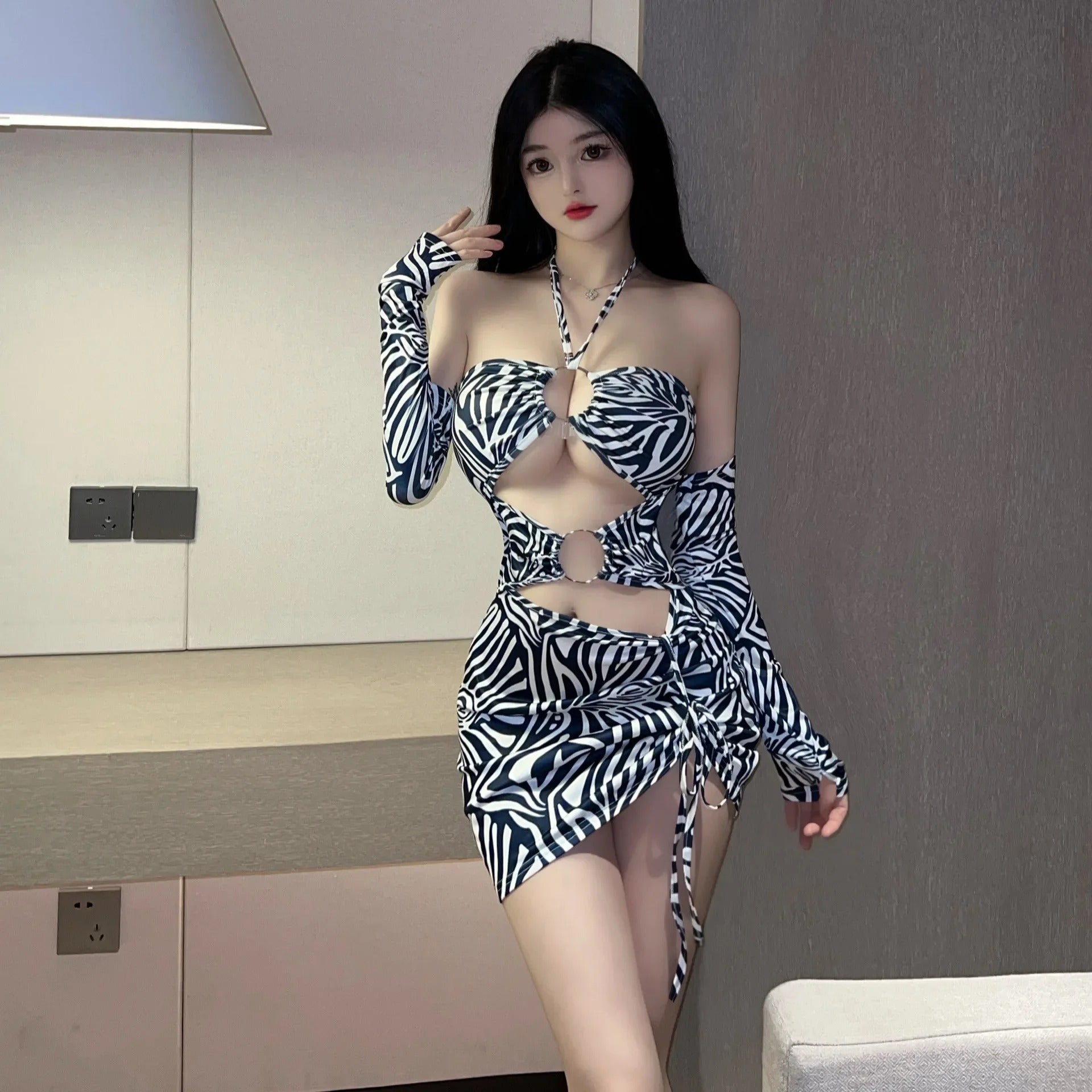 V Neck Hollow Sexy Tight Wrap Hip Rockabilly Animal Print Dress