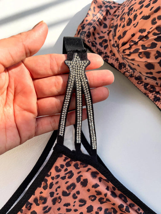 Sexy Leopard Suit Low-Cut Gathered Erotic Lingerie Three Pieces